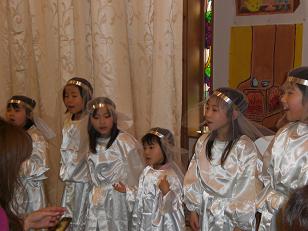 子供達も可愛らしい天使の姿で劇を盛り上げ、婦人会の方々もおばあさんや少年までそれぞれが楽しそうに演じられ、時に笑いあり、時に涙ありの劇は拍手喝采のうちに幕を閉じた。
