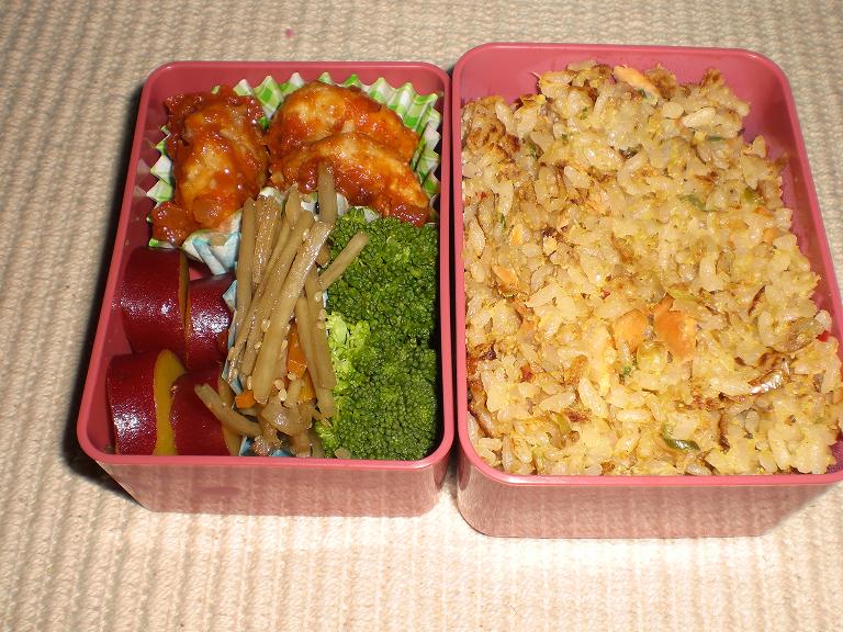 お弁当作りは、ご飯を鮭炒飯にして、あとは作ってあったおかずを詰めただけ。