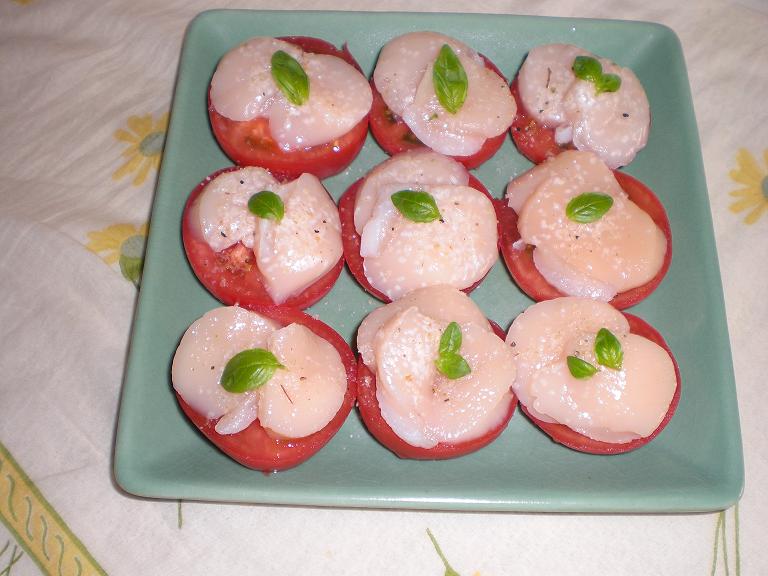 切ったトマトの上にお刺身用ホタテを乗せ、バジルの葉を飾る。