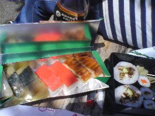 一通り桜を愛でた後、桜の枝が張り出した下という絶好の場所のベンチをキープすることに成功し、そこで買って来たお寿司を食べる。