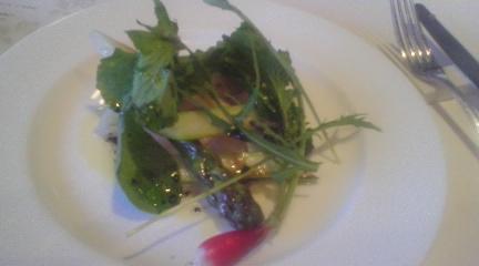 前菜の春野菜のゼリー寄せにも入っていたけど、とにかくサラダのアスパラがメチャメチャ美味いっ。