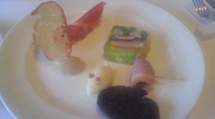 前菜5種の盛り合わせ(フォアグラのムースとか、生ハムメロンとか、春野菜のゼリー寄せとか)、ホワイト&グリーンアスパラのサラダ 真鯛のオリーヴ風味、時しらずのオーブン焼き。