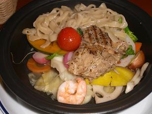 タジンの中には季節の野菜の他に鶏肉と生パスタが入っていて、それをチーズソースに絡ませて食べるというもの。